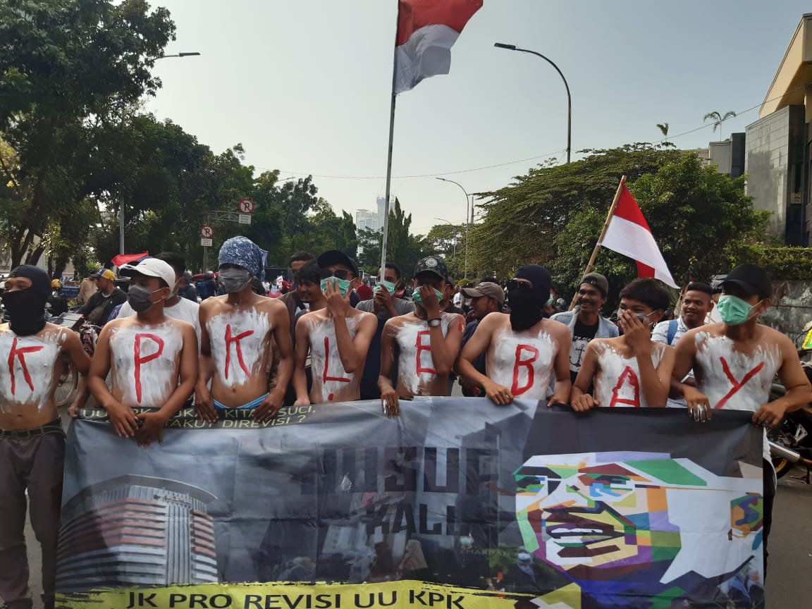 JAKARTA – Ribuan massa pro revisi UU KPK mengepung Gedung Merah Putih Komisi Pemberantasan Korupsi (KPK), Senin (16/9/2019).