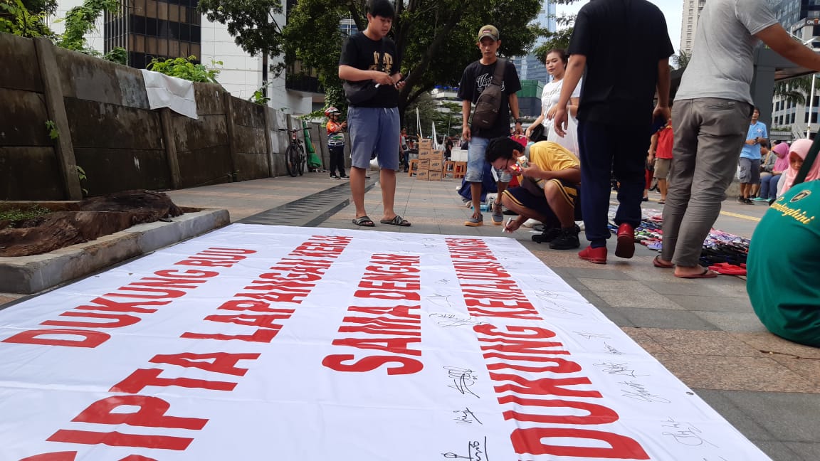 Aksi tersebut dilakukan dengan cara penandatanganan petisi diatas kain putih sepanjang 3 meter bertuliskan mendukung RUU Cipta Lapangan Kerja demi Indonesia Maju.