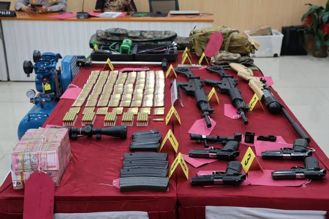 Polisi menyita dua pucuk senjata laras panjang jenis SS1 VI dalam kondisi belum terangkai, empat senjata api pendek jenis G2 Pindad, 5 buah magazine, 882 butir amunisi berbagai kaliber dan satu pucuk senapan angin.