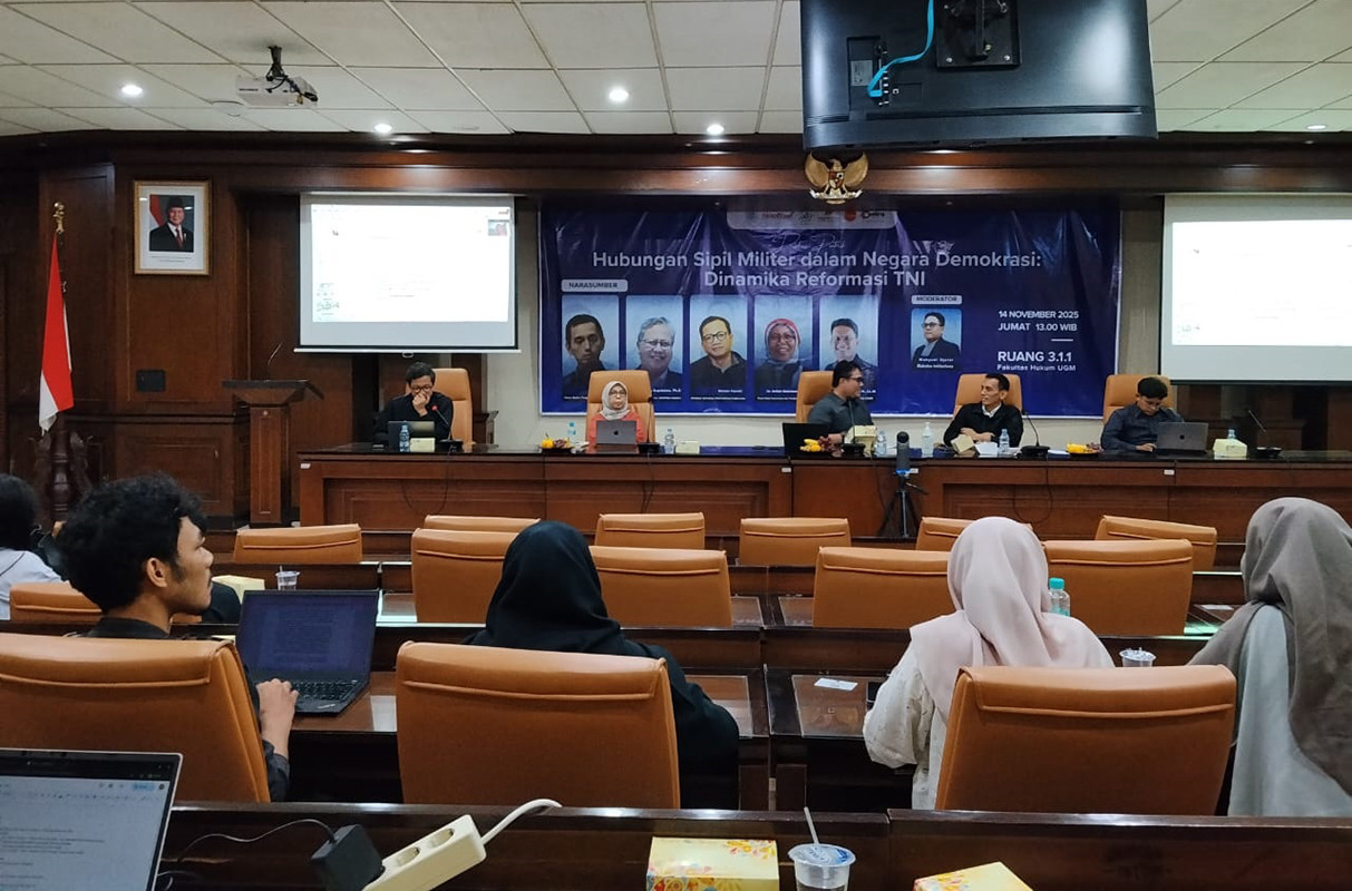 Wakil Dekan Bidang Penelitian Pengabdian kepada Masyarakat dan Sistem Informasi FH UGM, Dr. Heribertus Jaka Triyana, S.H., LL.M., M.A berpandangan sama saat memberi kata sambutan. Ia melihat munculnya dorongan sebagian pihak militer kembali terlibat penuh dalam domain sipil, sementara pengawasan melalui democratic civilian control yang seharusnya dijalankan DPR tidak berfungsi sebagaimana mestinya. “Ini yang menjadi referensi kita dalam hubungan sipil militer ke depan. Ini satu proses kita bernegara yang di dalamnya militer nampaknya menjadi aktor penting berpengaruh pada dinamika politik yang terjadi. Semoga dari diskusi ini menghasilkan hal baik untuk ditindaklanjuti,” terangnya.